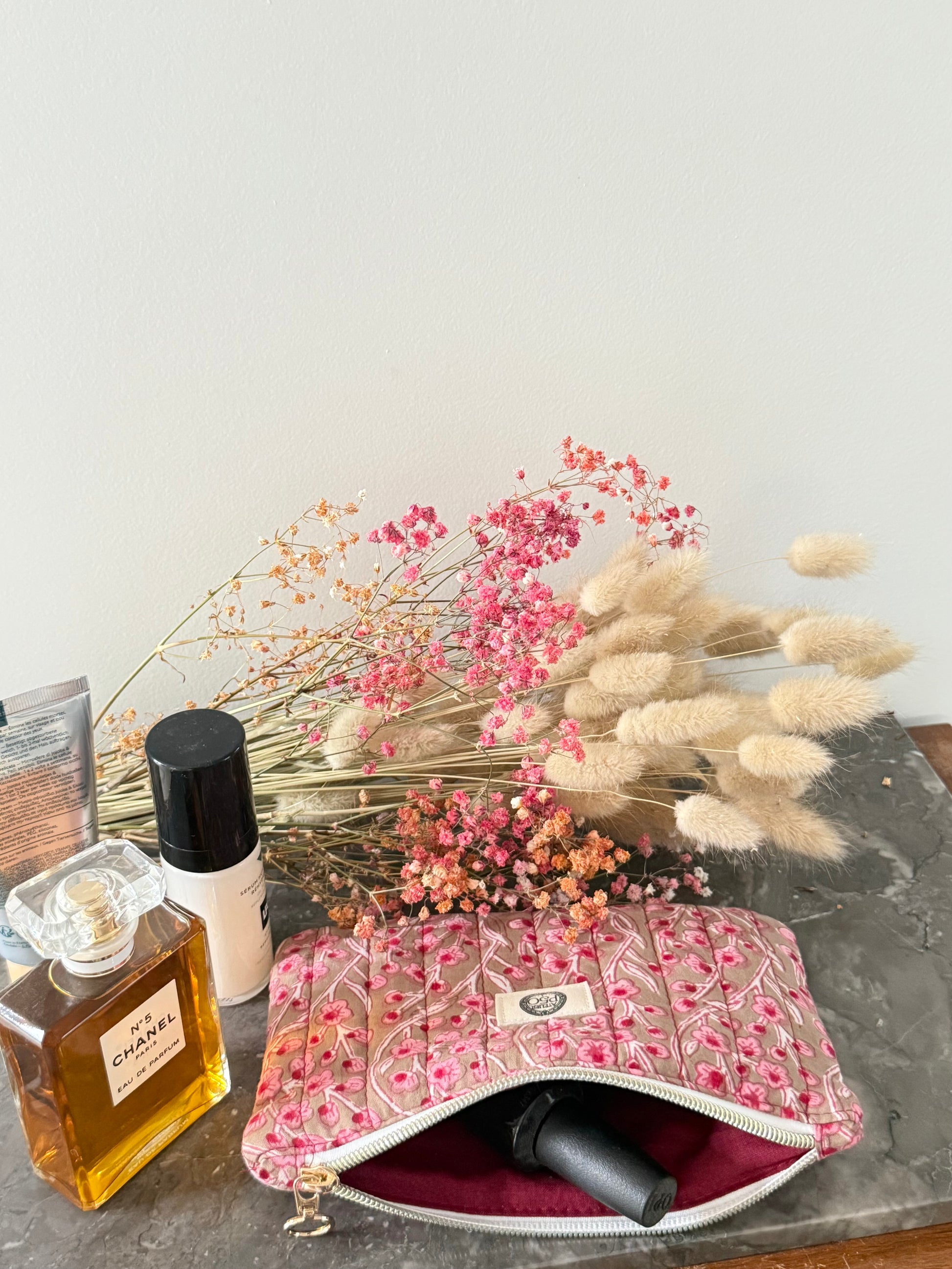 Voici la pochette plate petit modèle, cousue main dans mon atelier près de Lille, en tissu blockprint 100 % coton. À la fois discrète et pleine de charme, elle est pensée pour vous aider à mieux organiser votre sac et vos essentiels.