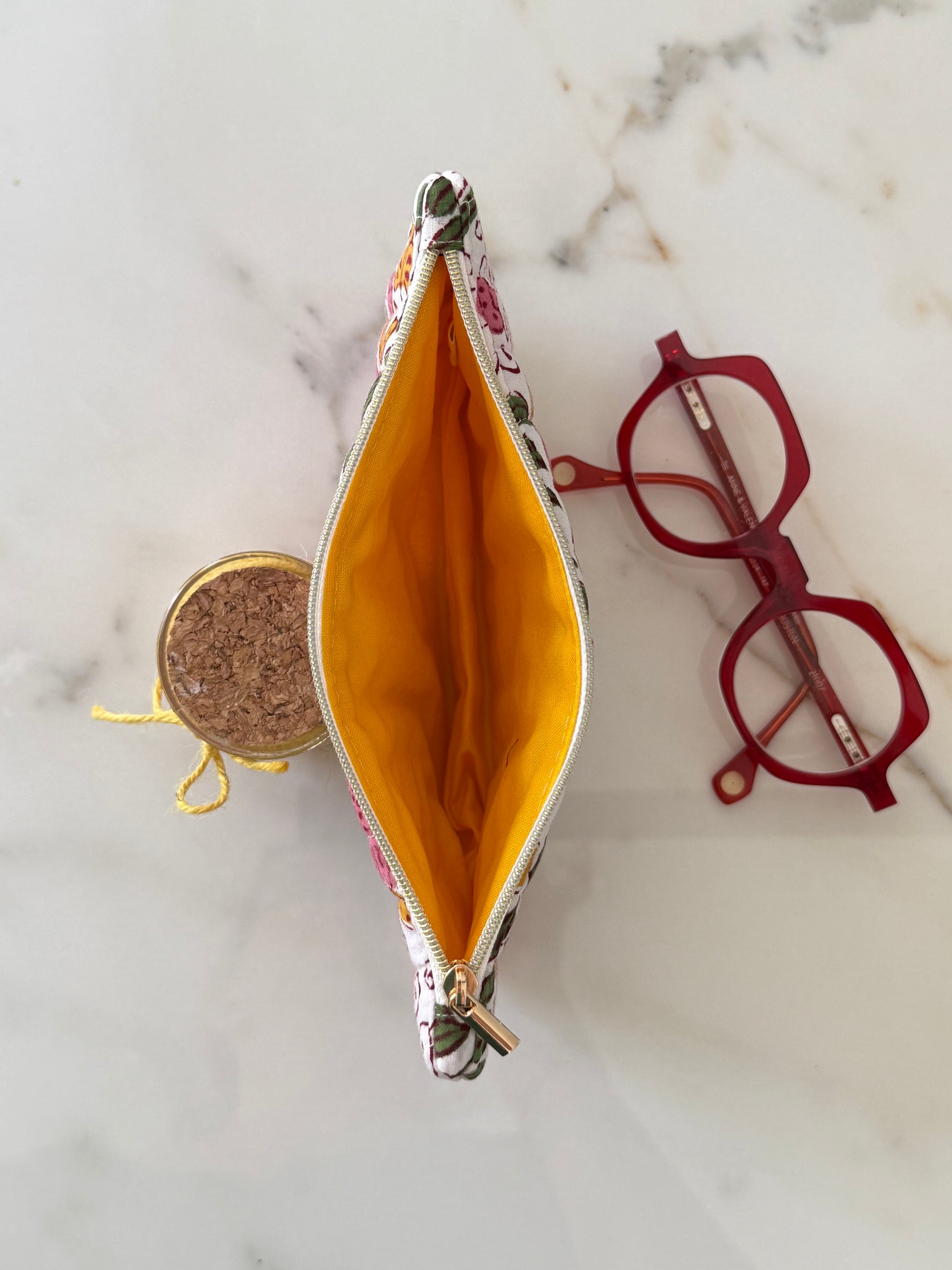 Voici la pochette plate petit modèle, cousue main dans mon atelier près de Lille, en tissu blockprint 100 % coton. À la fois discrète et pleine de charme, elle est pensée pour vous aider à mieux organiser votre sac et vos essentiels.