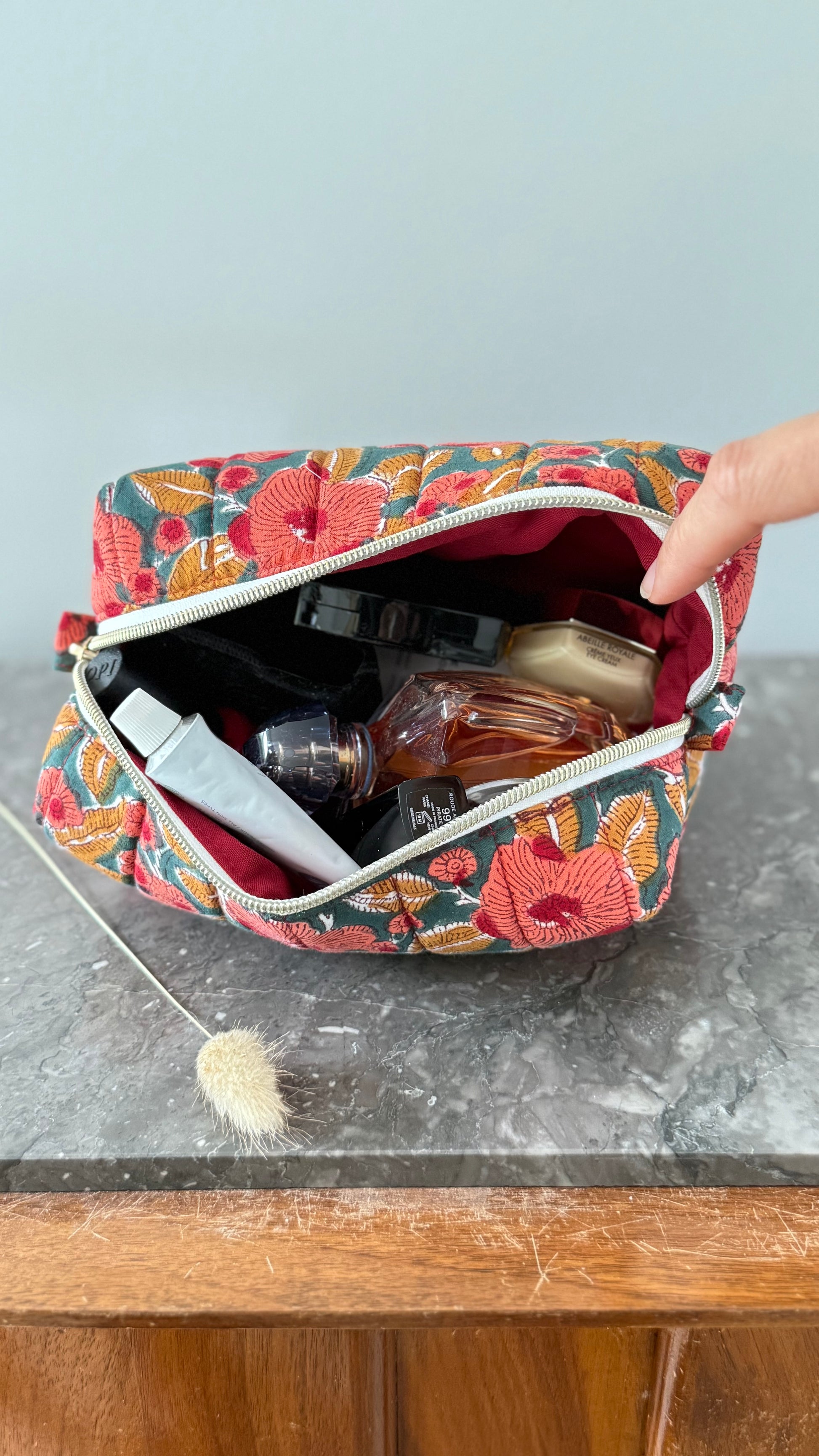 Confectionnée dans mon atelier près de Lille, la trousse de maquillage maxi est pensée pour accueillir tous vos essentiels de beauté et plus encore. Son tissu blockprint 100 % coton, imprimé à la main, apporte une touche artisanale et colorée à votre routine.
