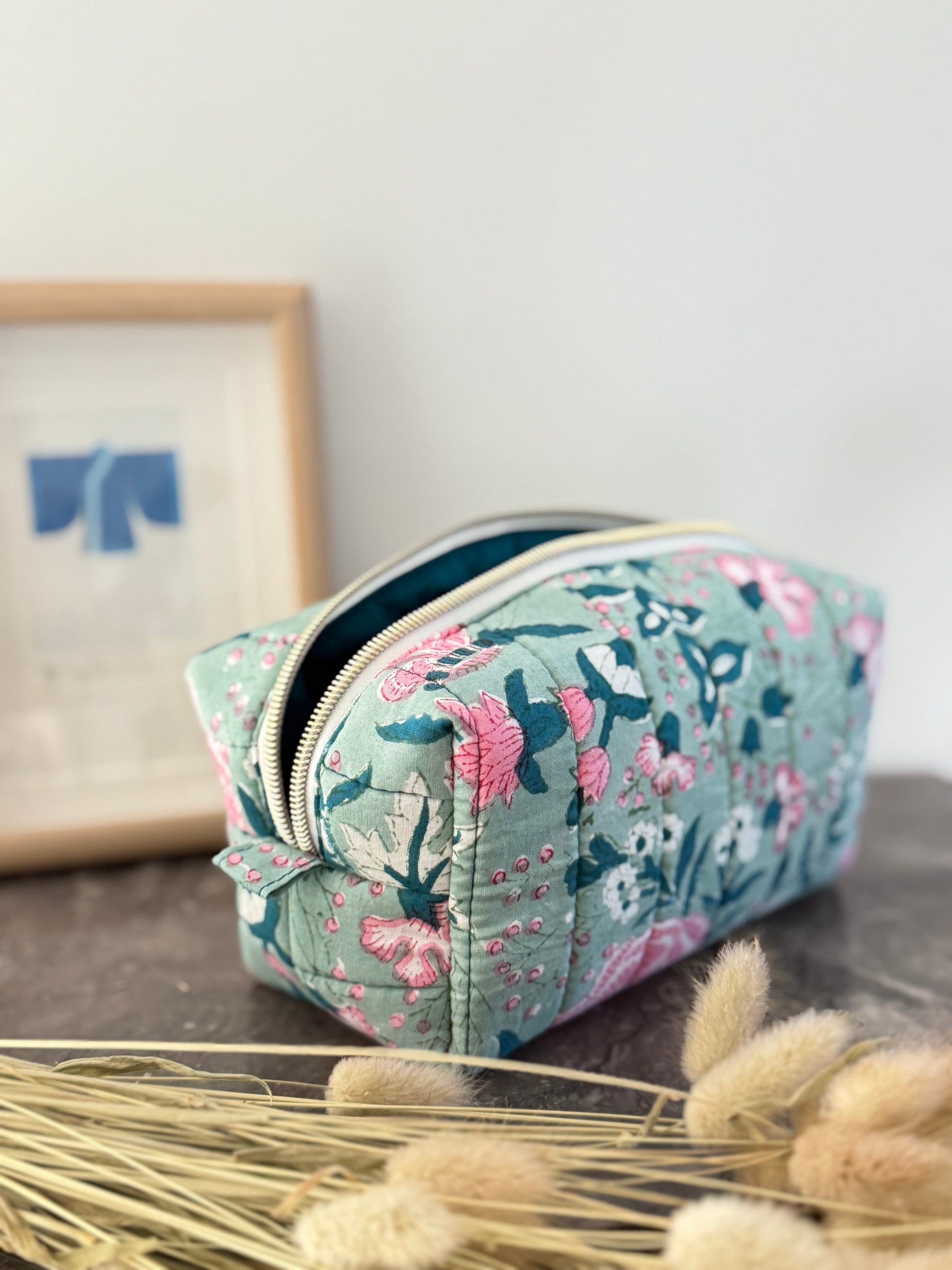Confectionnée dans mon atelier près de Lille, la trousse de maquillage maxi est pensée pour accueillir tous vos essentiels de beauté et plus encore. Son tissu blockprint 100 % coton, imprimé à la main, apporte une touche artisanale et colorée à votre routine.