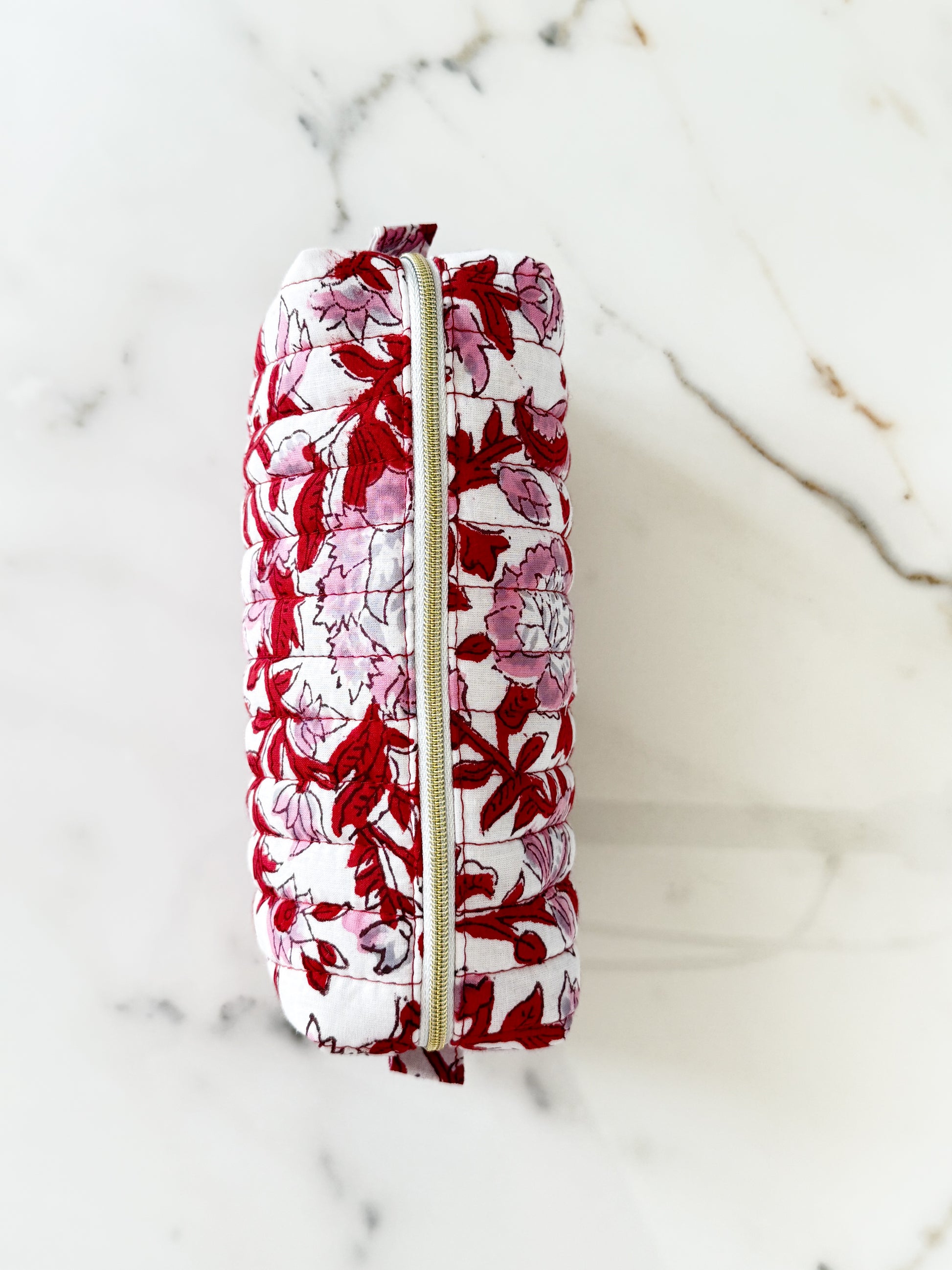 Cette trousse à maquillage en tissu blockprint, confectionnée avec soin dans mon atelier près de Lille, allie charme artisanal, praticité et engagement. Parfaite pour y glisser vos essentiels beauté, elle vous accompagne à la maison comme en voyage, avec élégance et douceur.